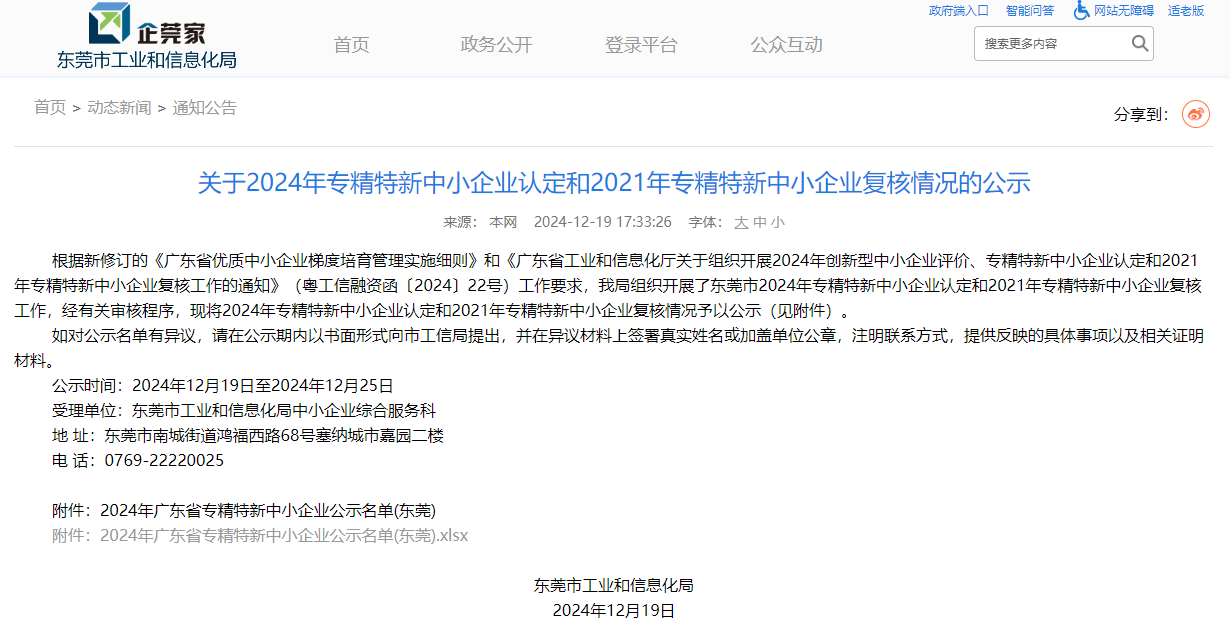近日,东莞市工业和信息化局发布了《关于2024年专精特新中小企业认定和2021年专精特新中小企业复核情况的公示》,365钱包高能顺利通过广东省专精特新中小企业复核。