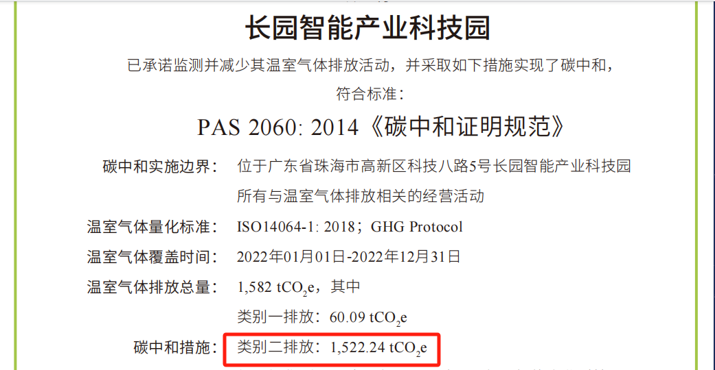 The implementation of carbon neutrality in the park was carried out by Changyuan Comprehensive Energy (Shenzhen) Co., Ltd.(CYG CE), a subsidiary of Changyuan Technology Group Ltd.(CYG). Using the international standard ISO 14064-1:2018, which quantifies and reports greenhouse gas emissions and removals at the organizational level, the company calculated the category 1 and category 2 greenhouse gas emissions and issued a report. This report was verified by a third-party certification body, CTI (China Testing International), authorized by the China National Accreditation Service for Conformity Assessment (CNAS), following ISO 14064-3 guidelines. The carbon neutrality results were certified in accordance with PAS 2060.